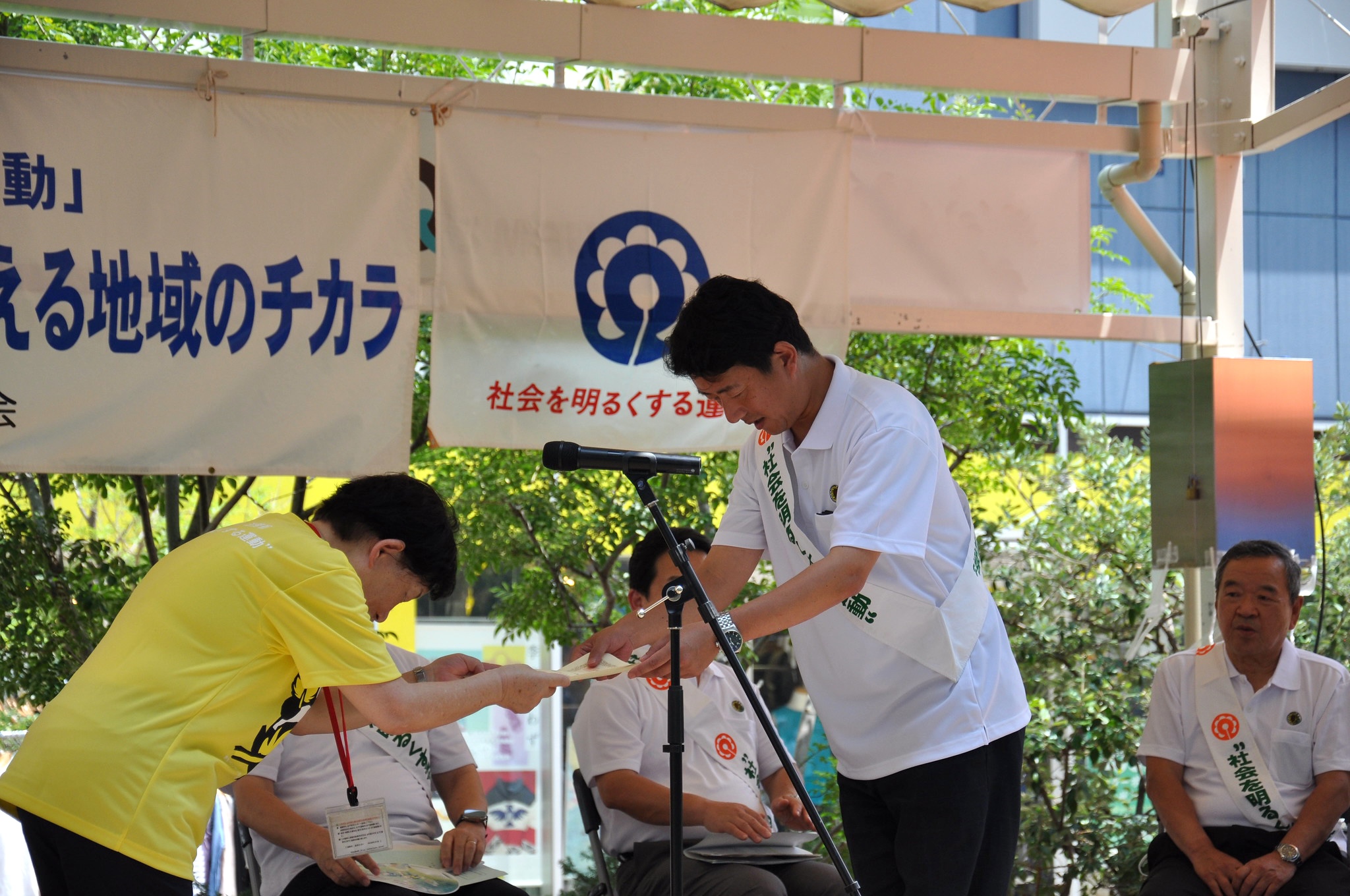 開催に際しては、あまがさきキューズモール、近隣の潮江社会福祉連絡協議会、尼崎東警察署からも多大なご支援・ご協力をいただき、3年連続の盛大な集会となりました。イベントを盛り上げた尼崎市少年音楽隊の隊員・関係者、そして暑さに負けずご参集の皆さま、歩道橋の上で応援してくださった方々に元気をいただきました。